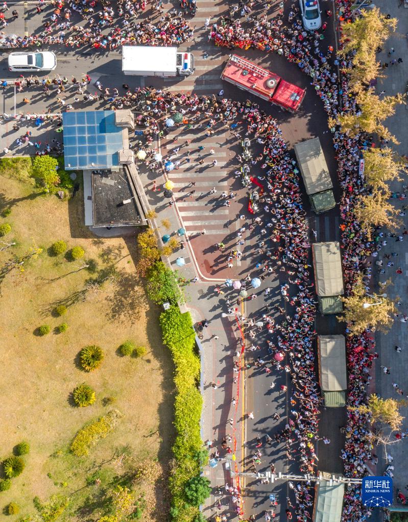 8月28日,在重庆市北碚区,群众自发来到道路两旁欢送森林消防队员(无人机照片)。