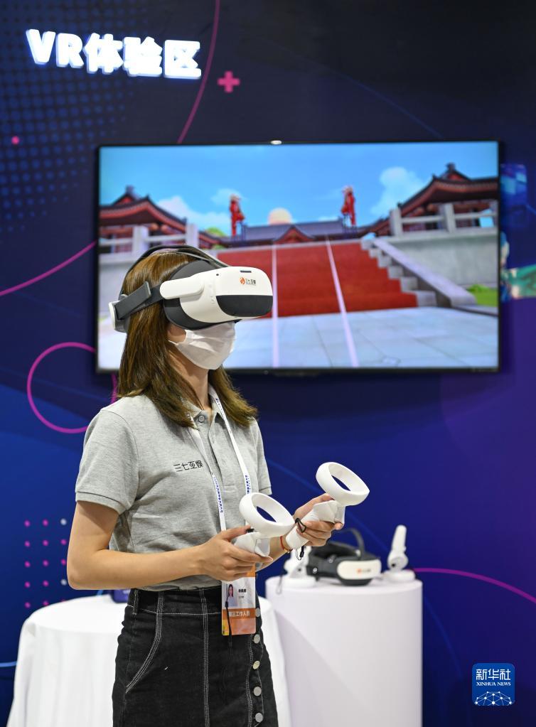 8月28日,在国家会展中心(天津),参会者在2022年中国网络文明大会展区内体验VR设备。