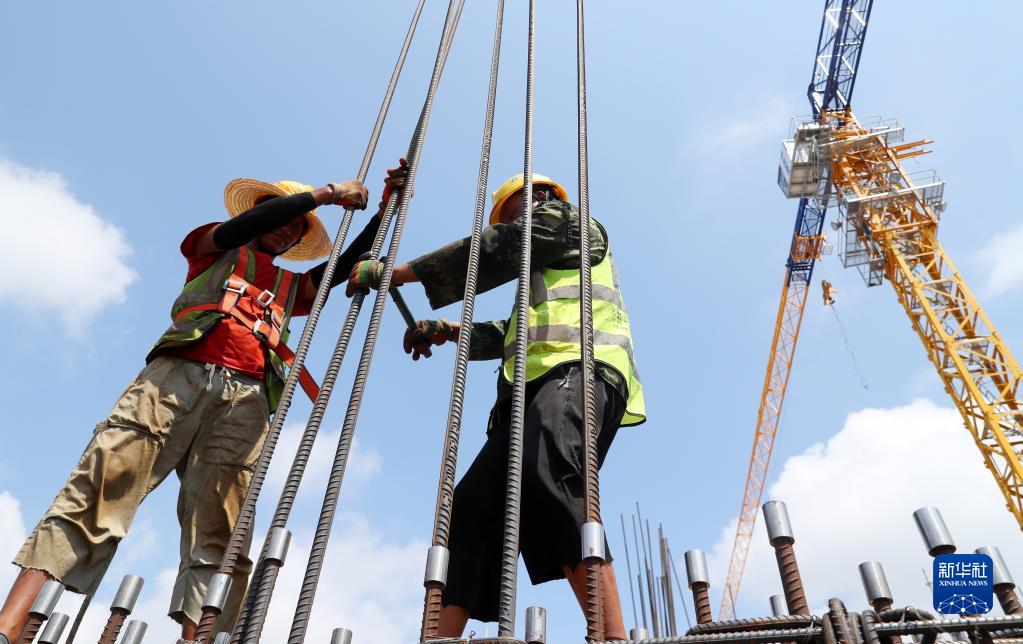 8月29日,工人在临港西岛金融中心项目工地上进行塔楼剪力墙钢筋绑扎作业。