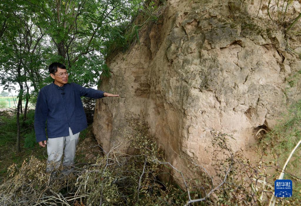南佐遗址联合考古队领队、中国人民大学历史学院考古文博系教授韩建业在考察遗址核心区内分布的大型夯土台情况(8月23日摄)。