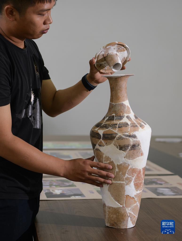 考古工作人员在展示南佐遗址内出土的带有盖塞的彩陶小口细颈平底瓶(8月25日摄)。