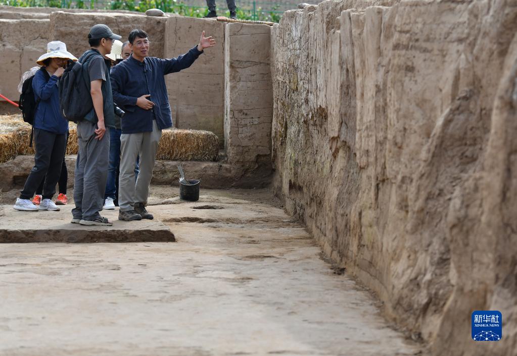 考古专家们在南佐遗址核心区大型宫殿建筑发掘现场考察(8月23日摄)。