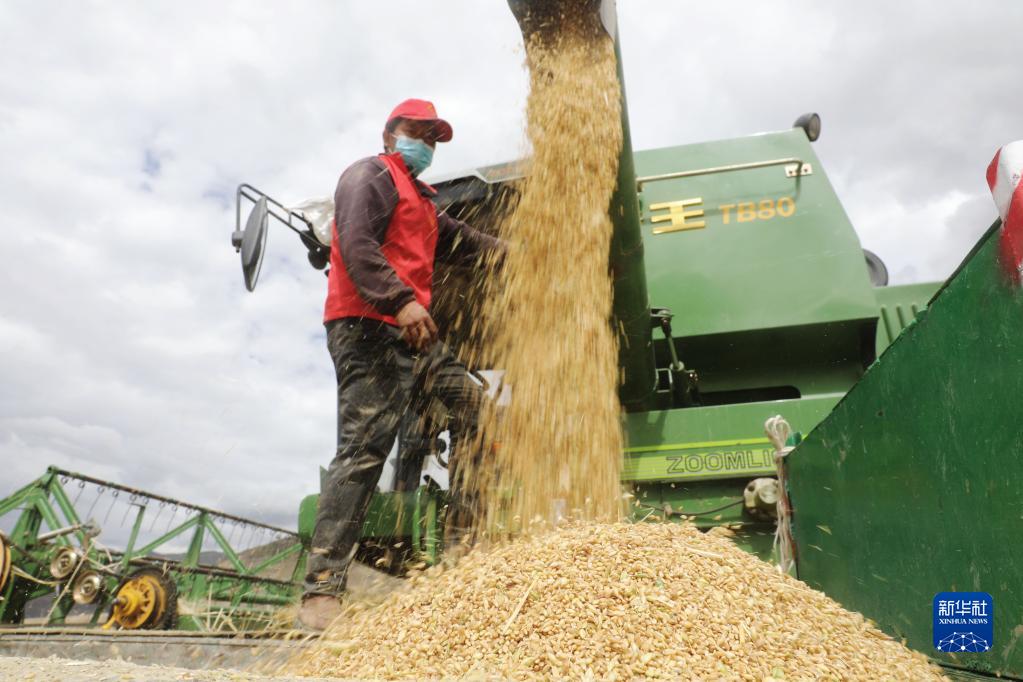 目前,西藏各地进入秋收时节。西藏拉萨市墨竹工卡县农民在积极防疫的同时,抓紧收割青稞,确保颗粒归仓。