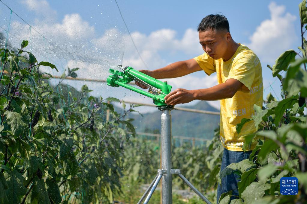8月25日,在遵义市务川县分水镇中坝村,村民调节自动喷灌系统给蔬菜基地的茄子浇水。