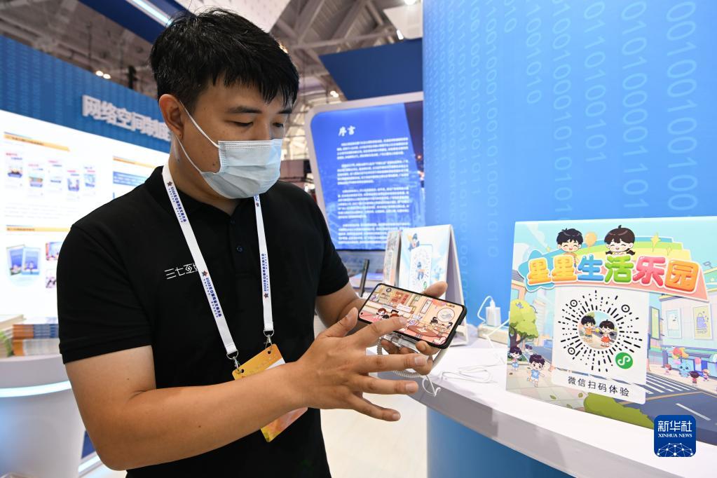 8月28日,在国家会展中心(天津),参展人员在2022年中国网络文明大会上展示一款为孤独症儿童开发的功能性应用软件。