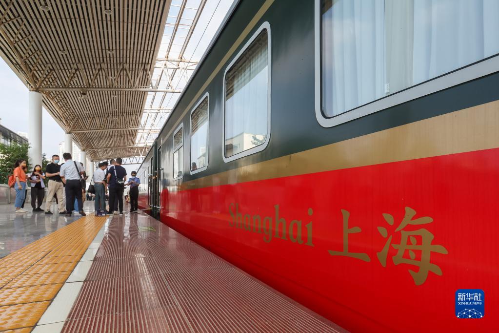 当日,Y701次上海至嘉兴“南湖·1921”红色旅游列车恢复开行。这是长三角地区疫情趋稳后,中国铁路上海局集团有限公司今年推出的首趟常态化开行的跨省红色旅游列车。