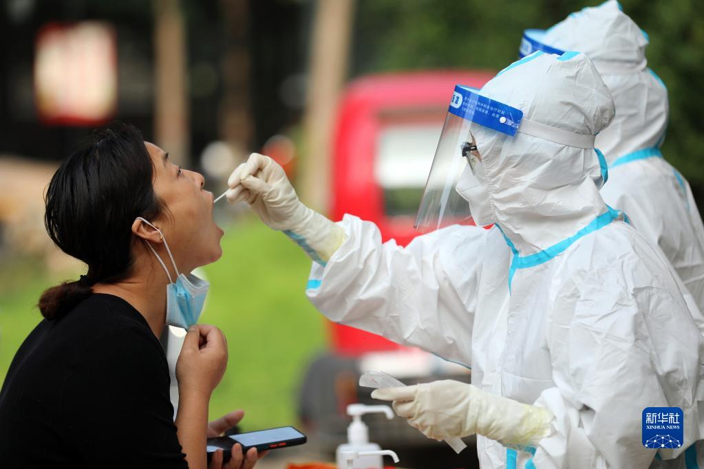 8月30日,在石家庄市众美绿都小区核酸采样点,市民接受核酸采样。