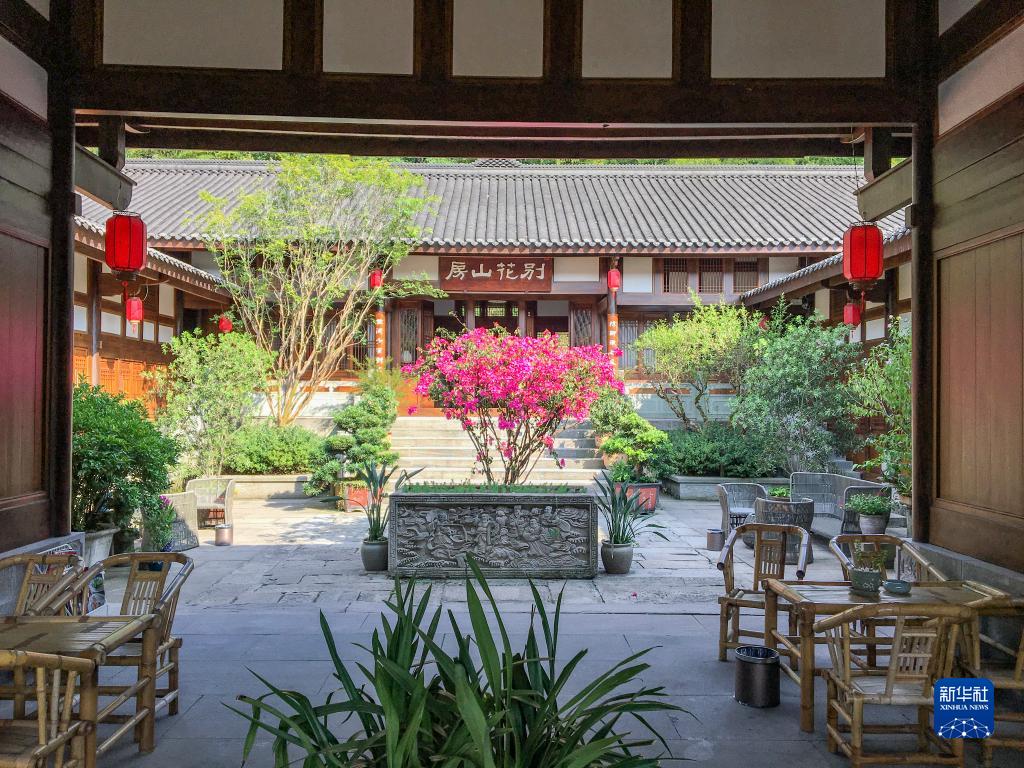 这是7月28日在重庆市巴南区天星寺镇芙蓉村拍摄的依托清代“廖家大院”旧址上复原建造的民宿“别花山房”。