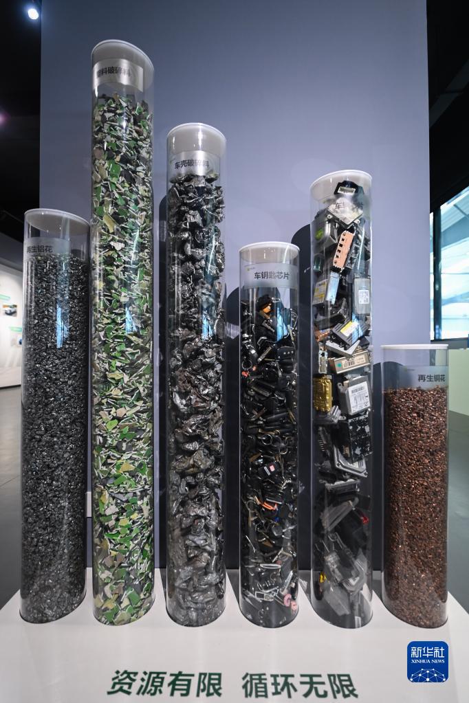 8月30日在湖州市吴兴区东林镇一家机动车回收拆解企业的展厅内拍摄的机动车拆解后可以分类再利用的资源。