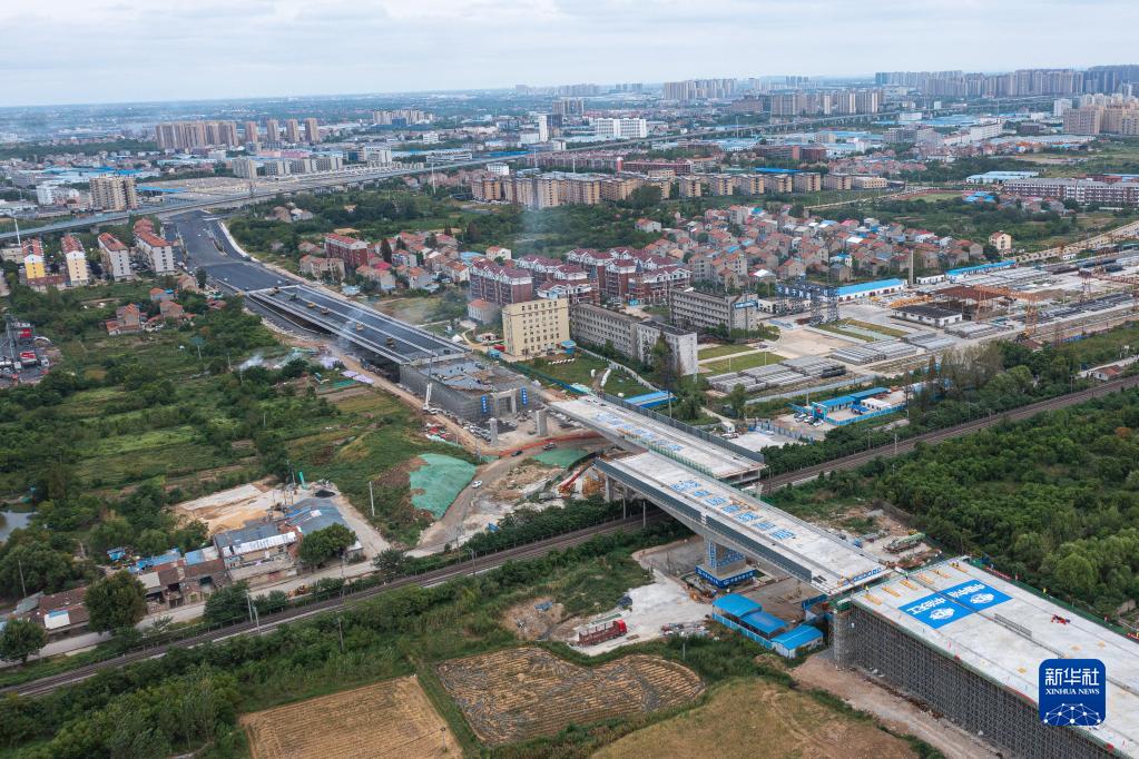 8月30日,湖北孝感跨京广铁路的桥梁成功转体(无人机照片)。