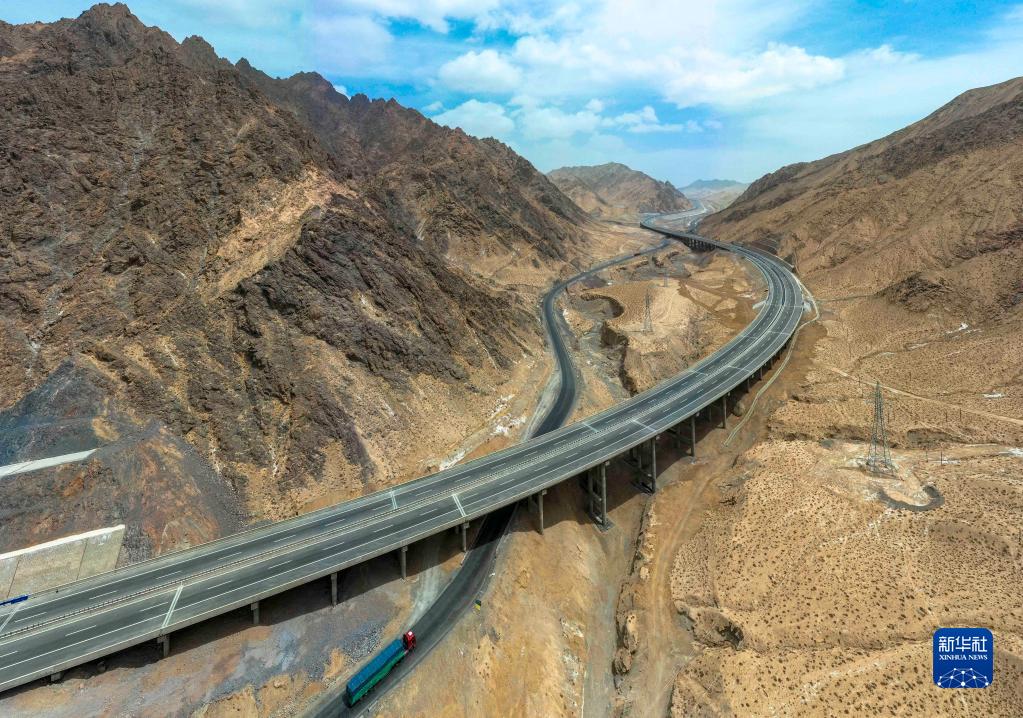 依若高速公路蜿蜒穿越新疆若羌县山区(5月9日摄,无人机照片)。