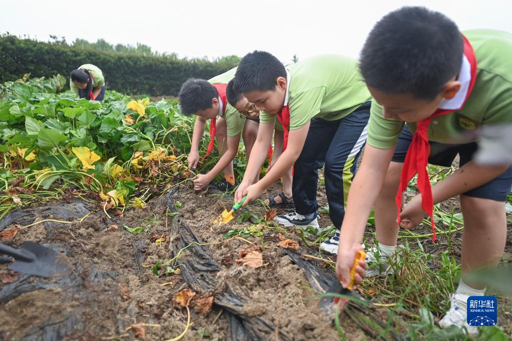 当日,在浙江省嘉兴市南湖区新丰镇中心小学的校园农场内,学生们参加收番薯、除草、浇水等特色劳动课程,开启新学期的“开学第一课”。新丰镇中心小学是浙江省拓宽校外劳动实践途径试点学校,依托校园农场形成了特色鲜明的劳动课程。