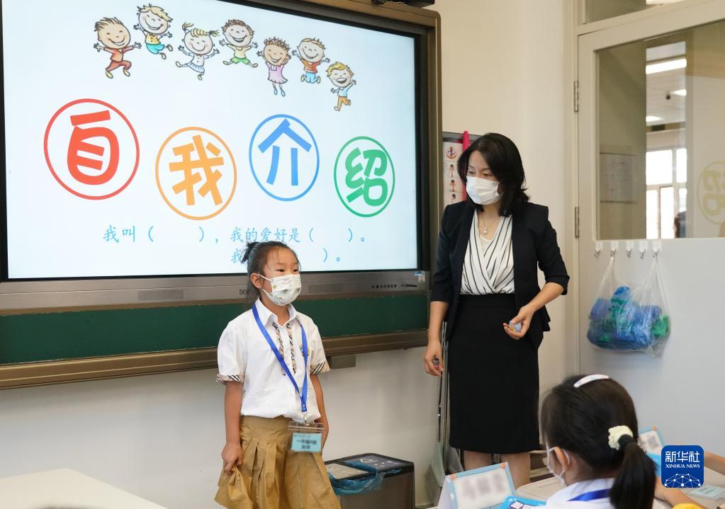 8月31日,在北京市海淀区中关村第一小学,一年级新生在学前培训中自我介绍。