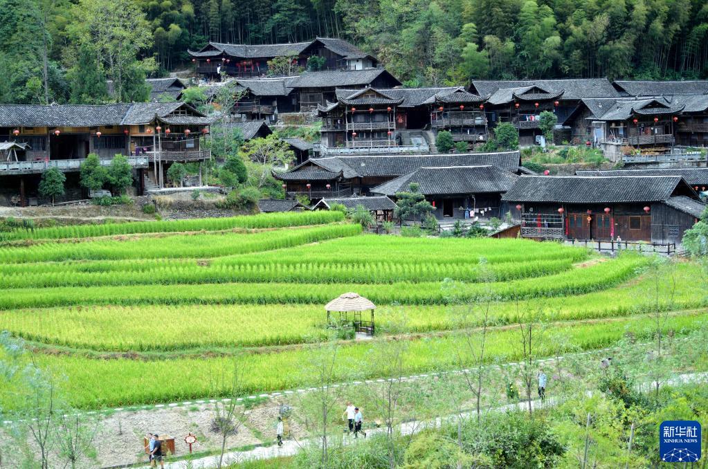 初秋时节,在湖北省宣恩县彭家寨风景区,古色古香的吊脚楼与起伏的田垄勾勒出一幅迷人的画卷。农民忙着“晒秋”,游客或乘坐小火车或步行游览,乐享秋日美景。彭家寨古吊脚楼群是鄂西山区保存较完好的民居群落,历史悠久的深山古寨经修缮保护,旅游服务等配套设施进一步提升,为当地乡村振兴注入了活力。
