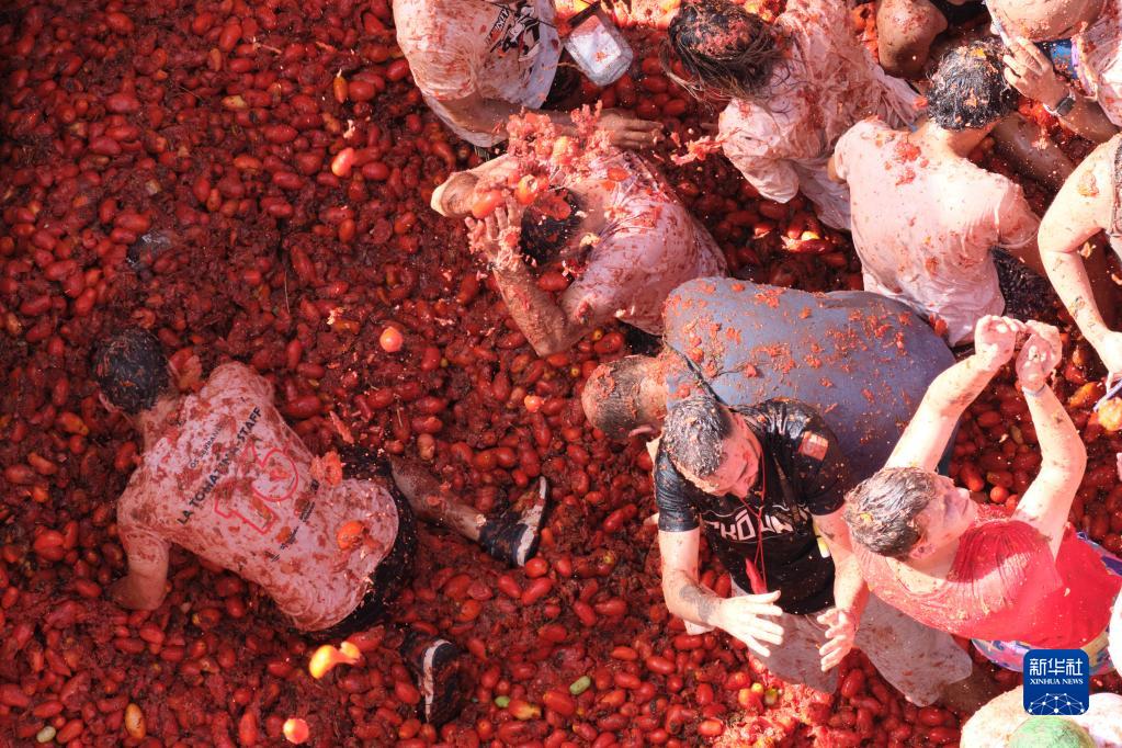 8月31日,在西班牙布尼奥尔举行的“西红柿节”上,人们参加“西红柿大战”。