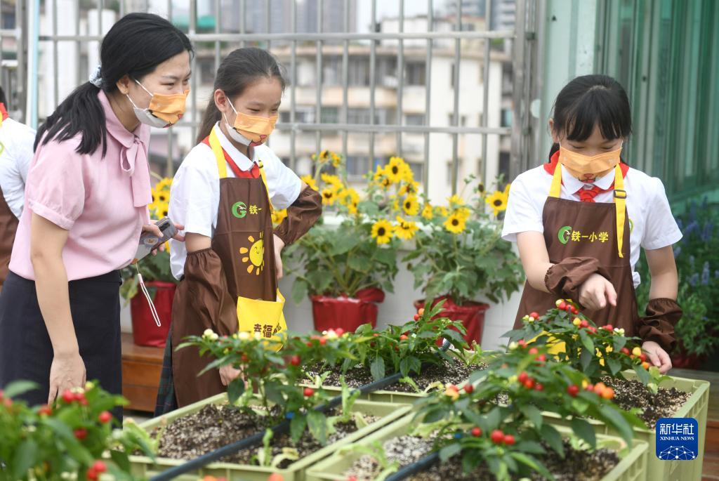 9月1日,广州市铁一小学的老师在劳动课上给学生们讲解辣椒的特性。