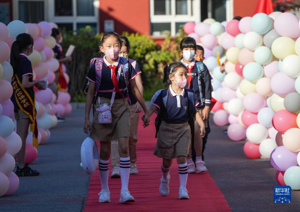9月1日,在北京市中关村外国语学校小学部,同学们走进学校。
