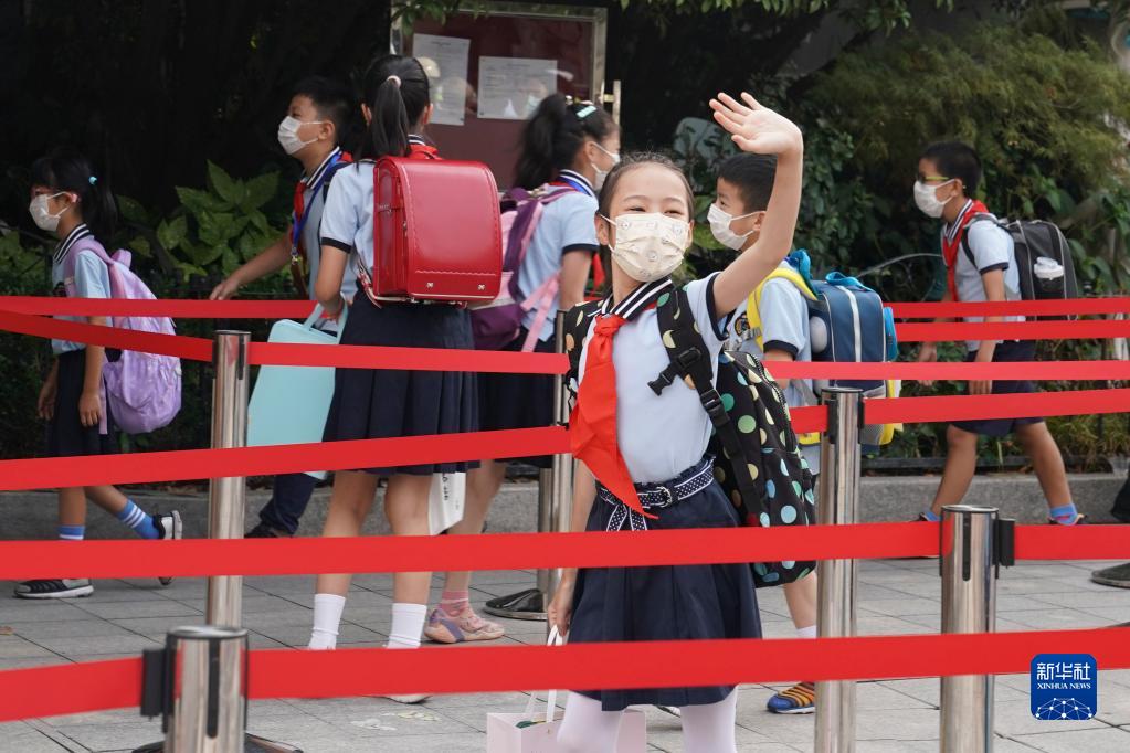 9月1日,上海市第一师范学校附属小学学生在入校时和家长告别。
