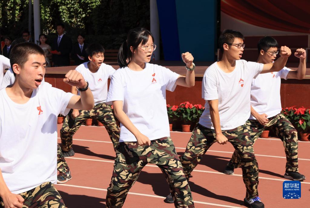 9月1日,中国人民大学附属中学分校的学生在开学典礼上表演军体拳。