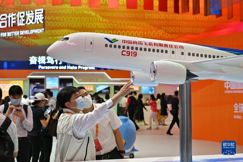 9月1日,观众在国家会议中心的中国服务贸易成就展专区内参观C919飞机模型。