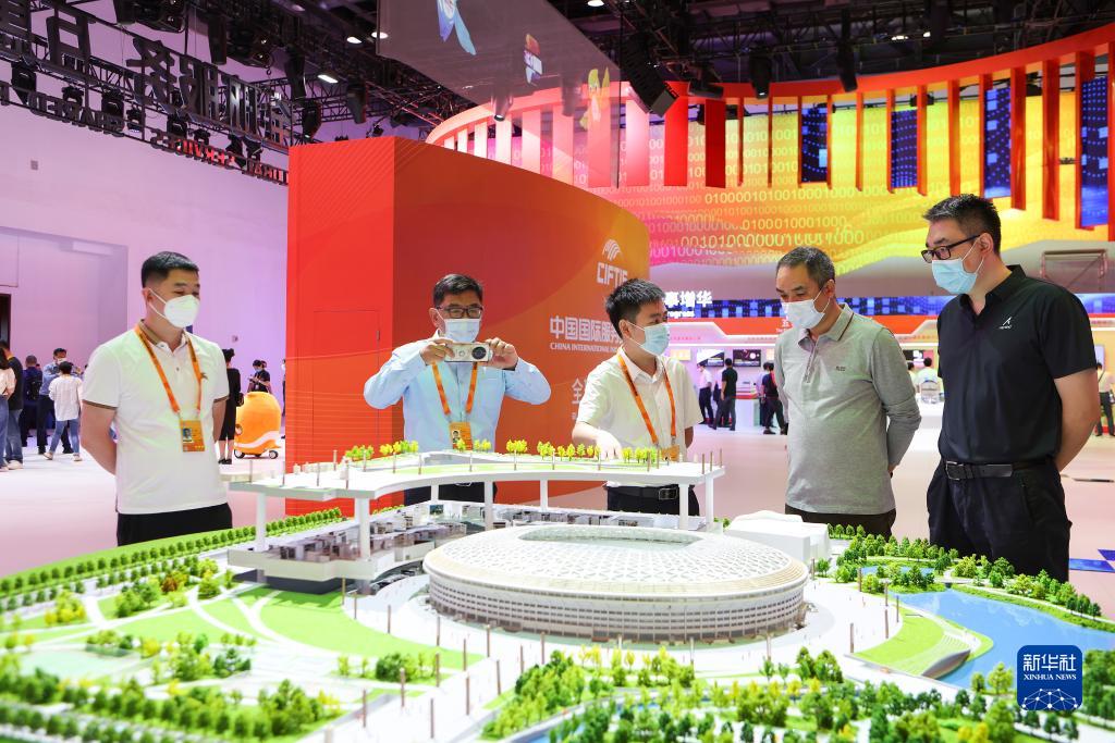 9月1日,观众在中国服务贸易成就展专区参观工体改造复建项目模型沙盘。