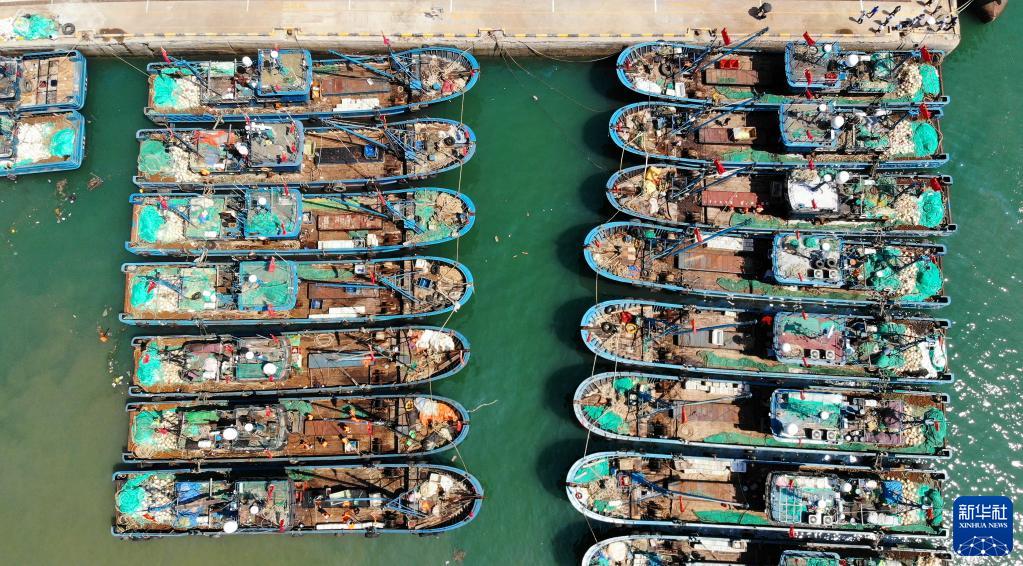 9月1日,在青岛西海岸新区积米崖码头,渔船准备出发(无人机照片)。