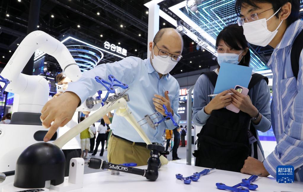 9月1日,工作人员(左一)向参观者介绍微创骨科手术机器人。当日,2022世界人工智能大会在上海世博中心拉开帷幕。今年大会的主题是“智联世界 元生无界”。新华社记者 方喆 摄