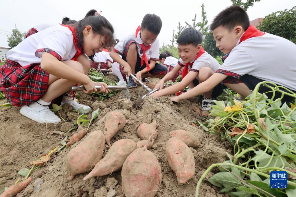 9月1日,浙江省湖州市德清县雷甸镇中心小学学生在校园农场挖番薯。