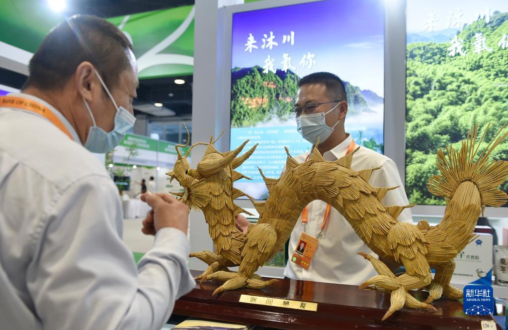 9月2日,在服贸会国家会议中心二期展馆内,工作人员(右)向观众介绍展出的沐川草龙。新华社记者 鲁鹏 摄