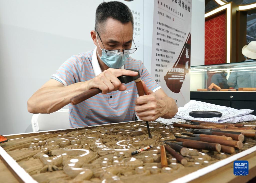 9月2日,参展者在服贸会文旅服务专题展区展示手工木雕技艺。新华社记者 张晨霖 摄