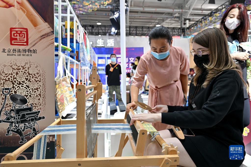 9月2日,一名俄罗斯观众在北京艺术博物馆展台体验传统织布。新华社记者 李鑫 摄