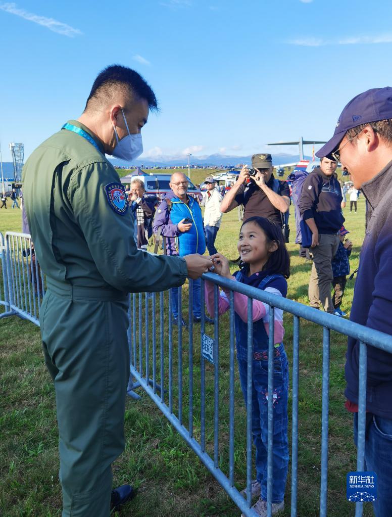 9月2日,在奥地利采尔特韦格机场,中国空军运-20飞行员与航展观众交流。