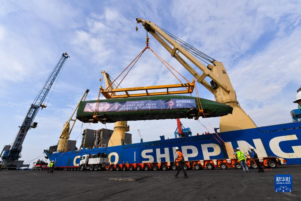 9月2日,在印度尼西亚雅加达丹戎不碌港举行的运抵仪式上,雅万高铁高速动车组在港口卸船。