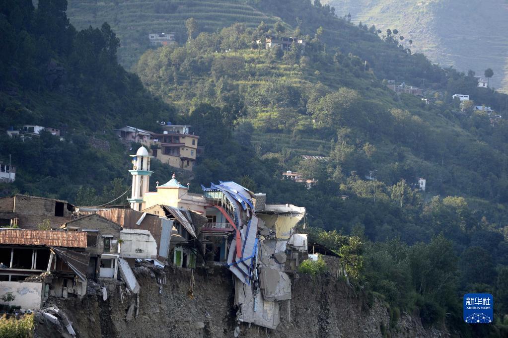 这是9月1日在巴基斯坦开伯尔-普什图省斯瓦特地区拍摄的被洪水损毁的房屋。