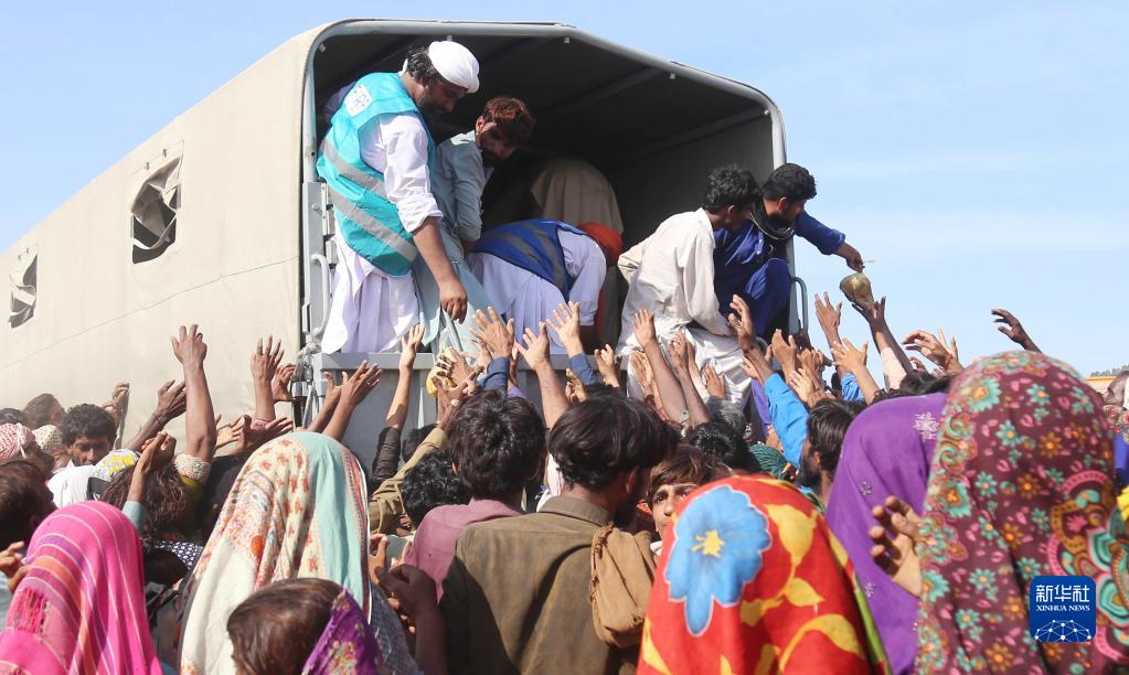 9月1日,在巴基斯坦南部信德省受洪水影响的贾姆舒鲁地区,志愿者为受灾民众分发食物。