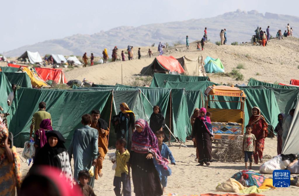这是9月1日在巴基斯坦南部信德省受洪水影响的贾姆舒鲁地区拍摄的受灾民众。