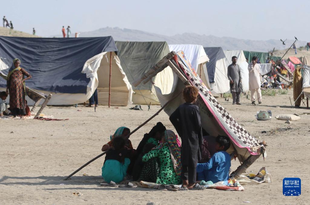 这是9月1日在巴基斯坦南部信德省受洪水影响的贾姆舒鲁地区拍摄的受灾民众。