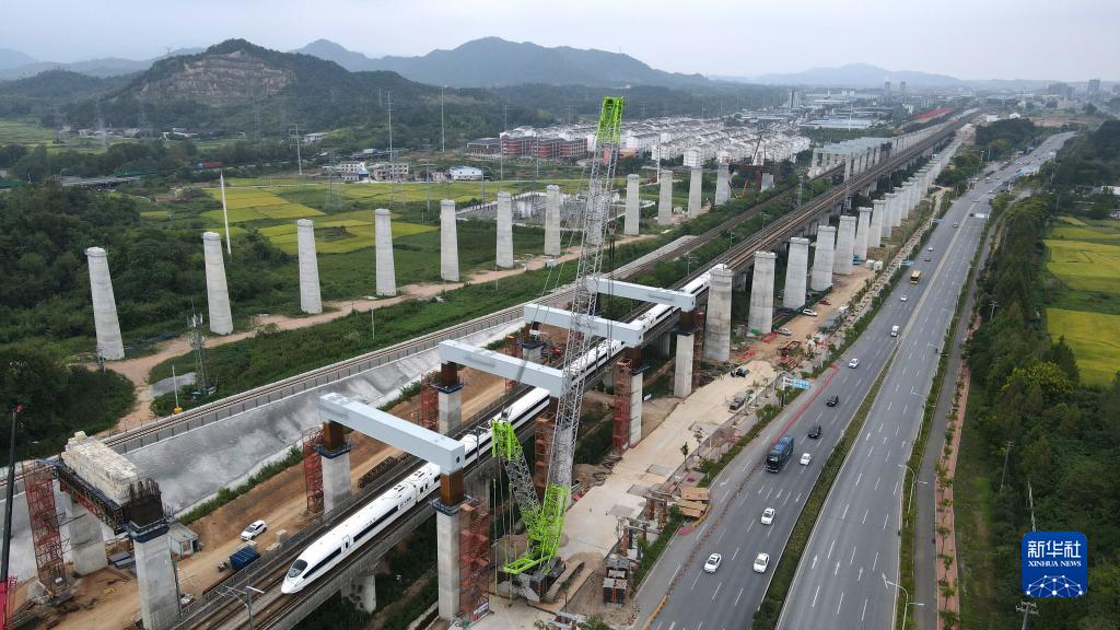 9月3日,一列高铁列车经过完成吊装后的门式墩钢盖梁(无人机照片)。