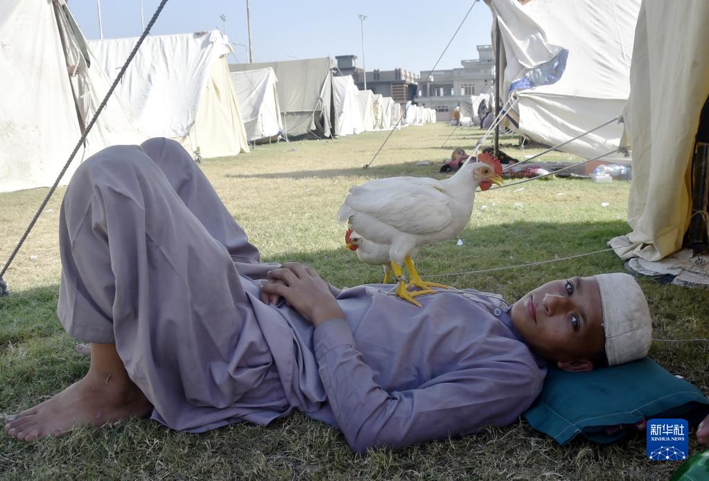 8月31日,在巴基斯坦西北部开伯尔-普什图省的贾尔瑟达地区,一名小男孩在救灾帐篷外休息。