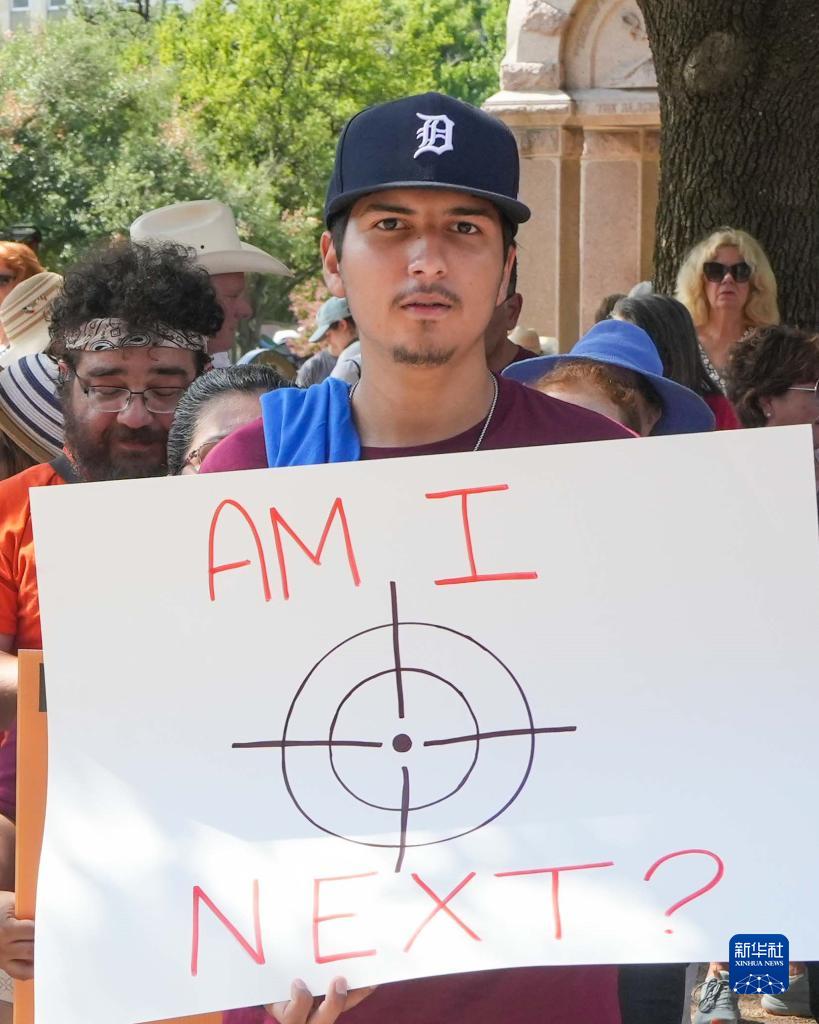 当日,包括得州小学枪击案遇难者亲属在内的抗议者在奥斯汀市举行集会呼吁控枪。5月24日发生在得州尤瓦尔迪市罗布小学的枪击案造成19名小学生和两名教师死亡,震动全美。
