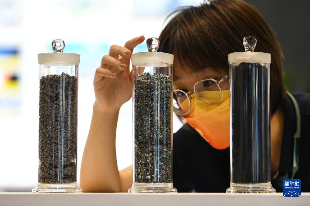 9月3日,在环境服务专题展区,观众在参观固体回收燃料。