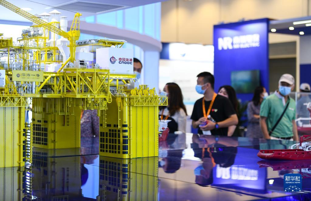 9月3日,在环境服务专题展区,观众在参观“深海一号”能源站模型。