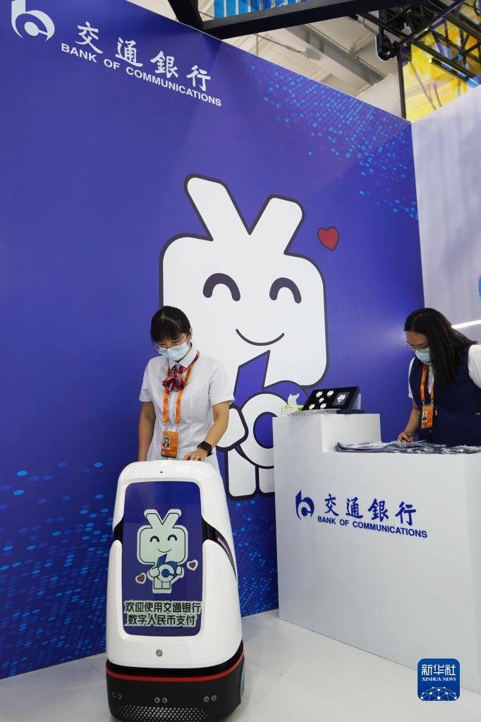 9月4日,在服贸会首钢园区金融服务专题展上,一位交通银行工作人员操作数字人民币支付智能机器人。 新华社记者 金皓原 摄