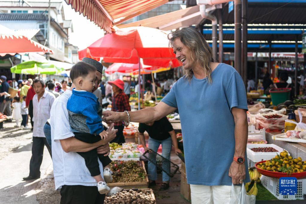 8月28日,林登在喜洲古镇早市和小朋友打招呼。