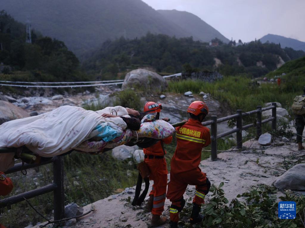 9月5日,四川森林消防总队甘孜支队消防员在泸定县磨西镇青岗坪村转移伤员。