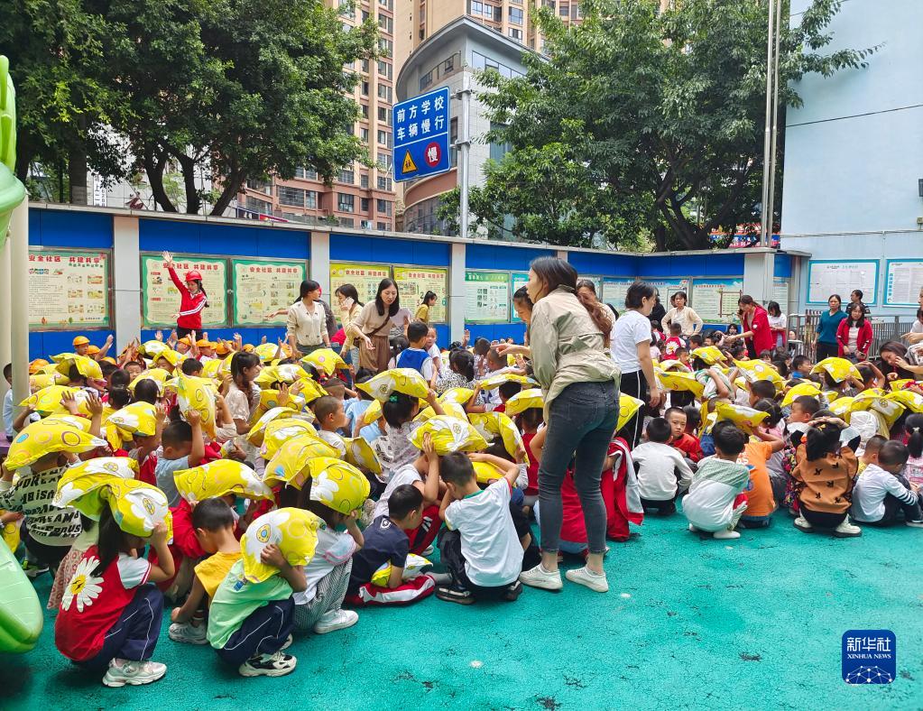 9月5日,雅安市石棉县幼儿园老师组织幼儿有序疏散到操场,并对幼儿进行心理疏导。