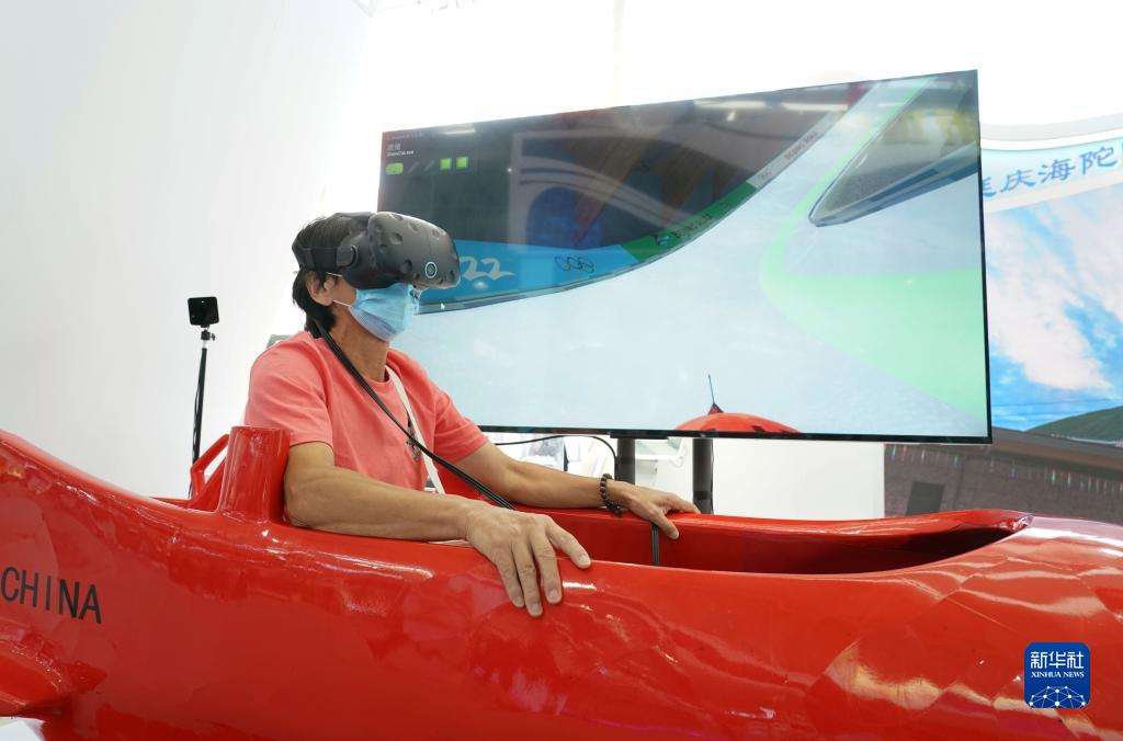 9月5日,在服贸会首钢园区的文旅服务专题展区,观众通过VR设备体验雪车。