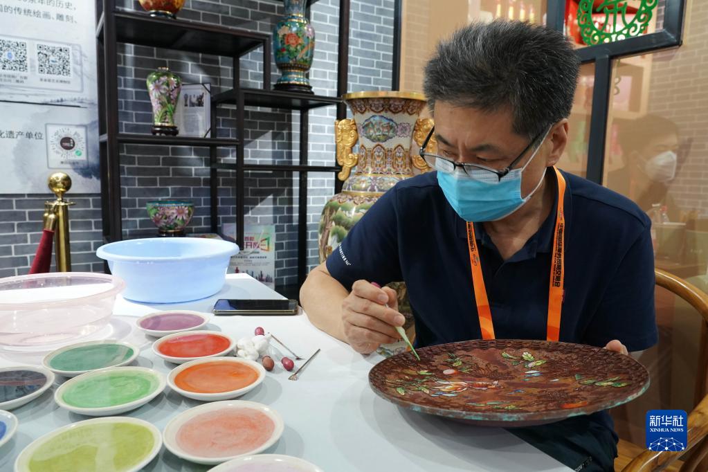 9月5日,在服贸会首钢园区的文旅服务专题展区,工作人员展示景泰蓝制作。