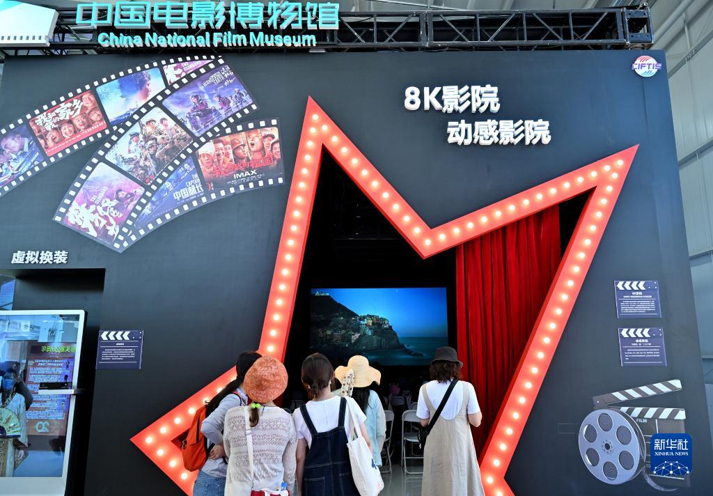 9月5日,在服贸会文旅服务专题展中国电影博物馆展台,观众排队进入8K影院体验。