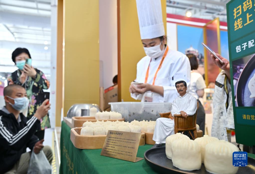 9月5日,在服贸会文旅服务专题展公园礼物展台,北京中山公园来今雨轩的厨师现场制作冬菜包子。